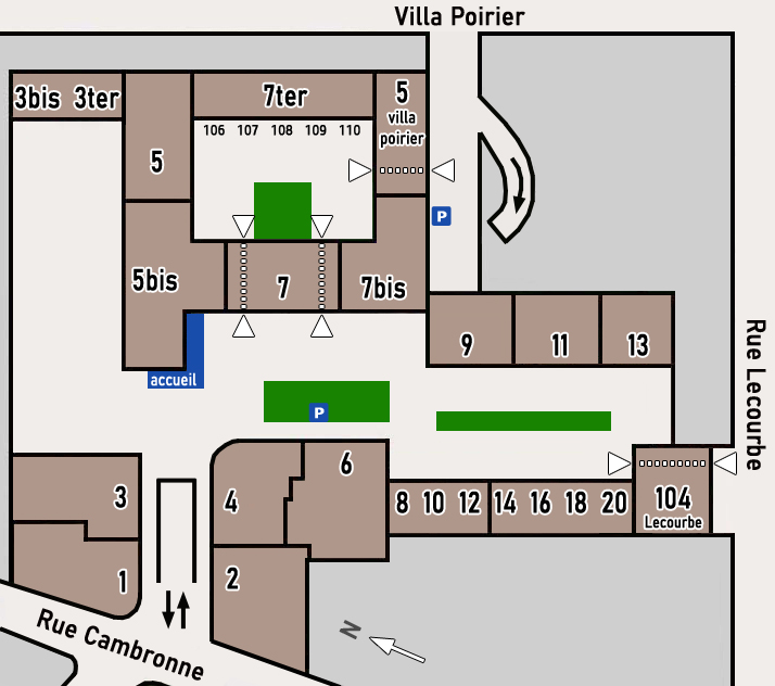 • 5 Villa Poirier : Situé juste à droite du 7 ter, le bâtiment est accessible par les 2 portes vitrées. Vous pouvez également accéder depuis la rue Villa Poirier (via Google Maps).